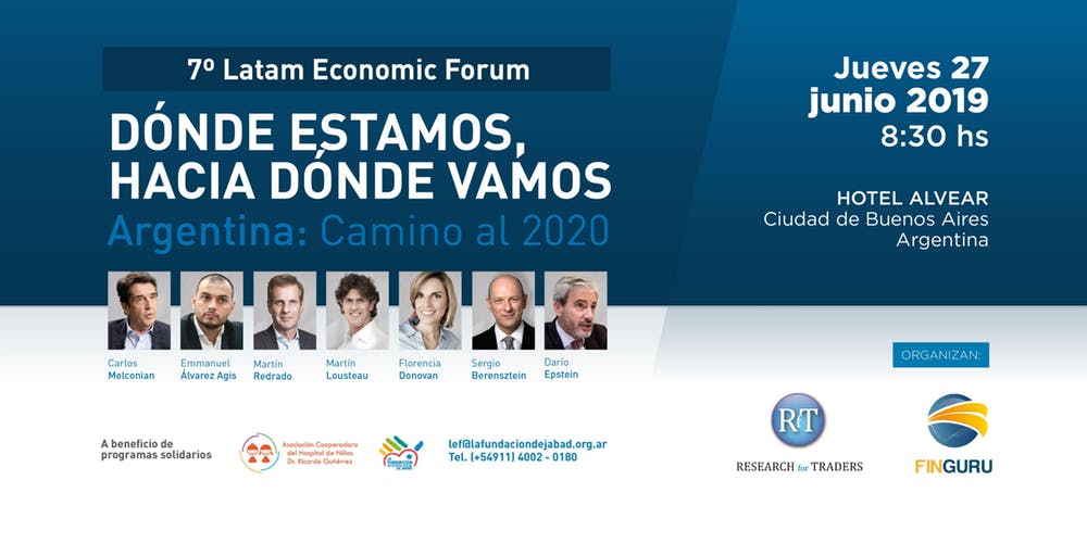 El Latam Economic Forum (www.latameconomicforum.com.ar) anuncia su séptima edición; un evento donde la economía y finanzas son protagonistas. Organizado por la consultora Research for Traders, y Finguru, el foro Dónde estamos hacia dónde vamos?, se llevará a cabo el día 27 de junio en el Hotel Alvear, a beneficio de la Fundación de Acción Social de Jabad, y la «Asociación Cooperadora del Hospital de niños Dr. Ricardo Gutiérrez». Los asistentes podrán escuchar disertaciones, a cargo de Carlos Melconian, Martin Redrado, Emmanuel Alvarez Agis, Martín Lousteau, Sergio Berensztein y Darío Epstein.